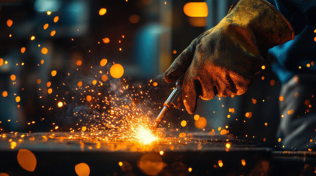 Close-Up View of Welding Torch with Sparks in Action, Concept of Industrial Craftsmanship, Metalwork Expertise, Fiery Art of Welding and Machinery Precision