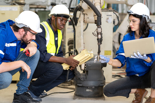 Industrial engineer working on robot arm maintenance in modern technology factory. Technician checking robotic automated welding torch machine to control welding process. Innovative engineering.