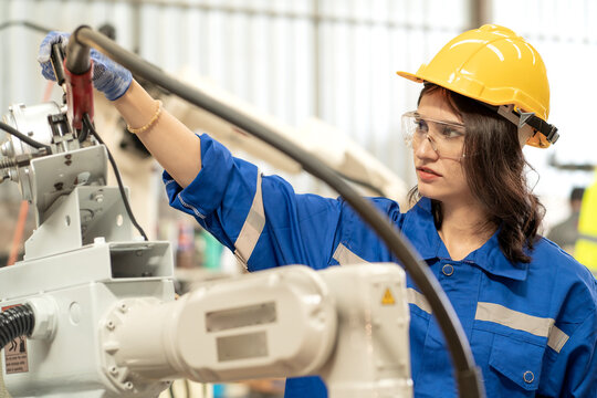 Industrial engineer woman working on robot arm maintenance in modern technology factory. Technician checking robotic automated welding torch machine to control welding process.Innovative engineering.