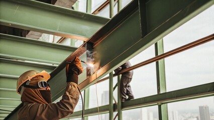 Welding metal beams highrise building construction scene urban environment worker perspective industrial action for seo impact