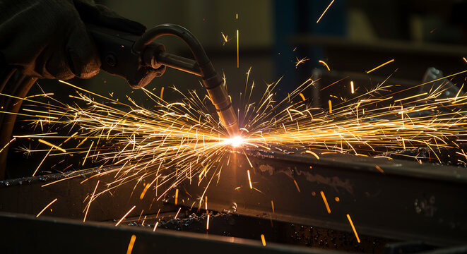A Welder's Hand Operating a Cutting Torch with Sparks Flying