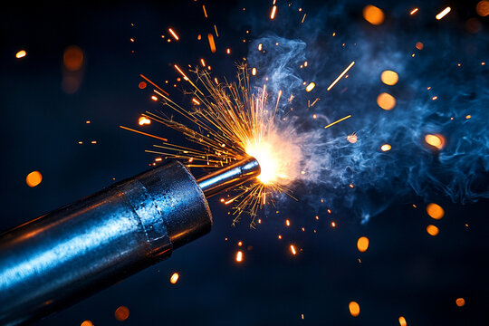 Welding Torch Sparks and Smoke Closeup of Industrial Welding Operation on Dark Background
