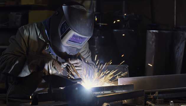 A welder wearing protective gear skillfully joins metal pieces, creating bright sparks in an industrial workshop setting.