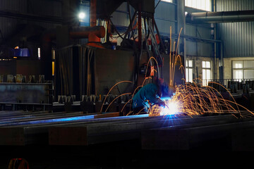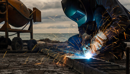 Construction worker welding a metal beam on a site. Featuring welding and heavy machinery