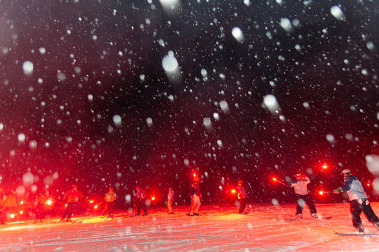 Snowfalling on a torchlight parade, Stowe, Vermont, USA