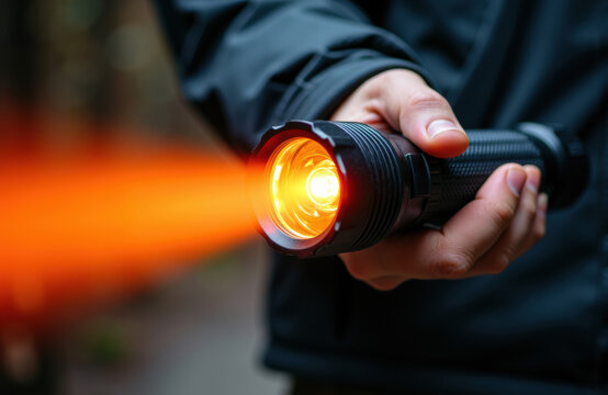 Person holding a flashlight emitting a bright orange beam in an outdoor setting