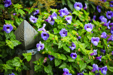 Blooming purple Bluewings torenia or Wishbone flower in garden. Copy space