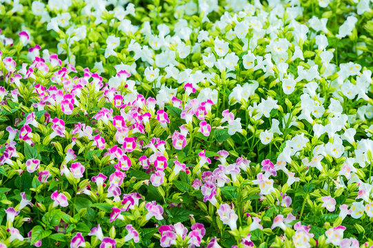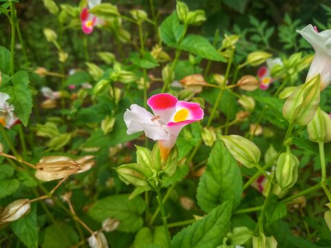 Wishbone flower: white flowers with yellow stamens curved into a two-pronged bone shape, similar to a bird's breastbone. Bluewings or Torenia is a flowering plant that can absorb toxins.