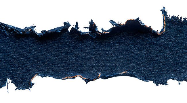 NAVY BLUE paper, torn strips of rugged denim with orange seam contrast on a white background.