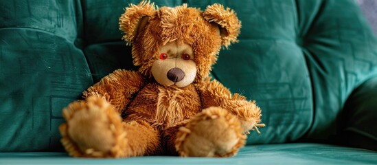 A blind brown teddy bear on a green couch with torn eyes due to a dog focused on the doll s eye with copy space image available