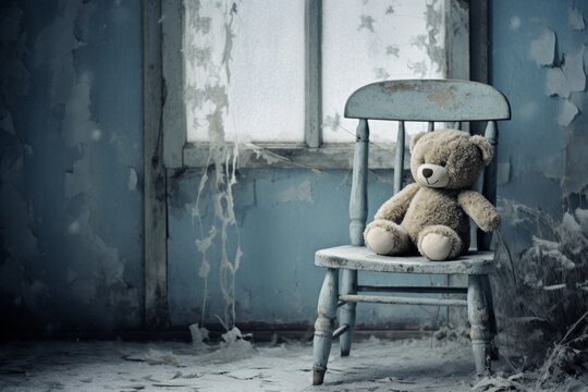 A stuffed forgotten toy teddy bear on chair in an abandoned house with cracked windows and peeling paint, copy space