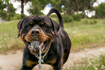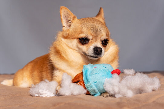 A red chihuahua dog lies on the bed and squints at a chewed and torn soft toy for dogs, this game is dangerous by suffocation and ingestion of a foreign body.