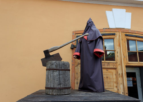 St. Petersburg, Russia - September, 10, 2016: The figure of the executioner in a cloak with a hood, with an ax and chopping block on a platform in the Peter and Paul Fortress.
