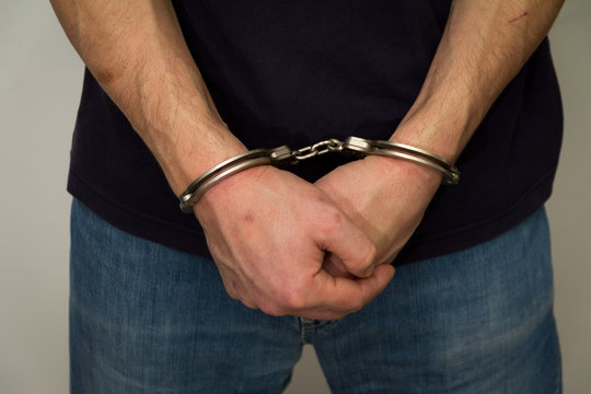 The arrested criminal handcuffed. Hands with handcuffs in the front
