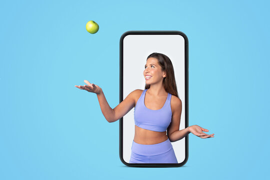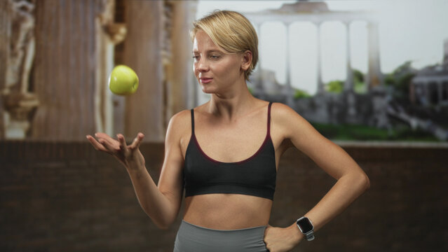 Woman tossing green apple with hand in studio, wearing sportsbra and leggings and smartwatch, midriff visible and attentive expression; focus training.