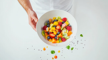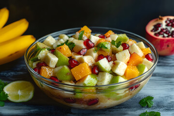 Bowl of colorful Fruit Chaat with a blend of apples, oranges, pomegranates, and bananas, tossed in a sweet and tangy dressing.