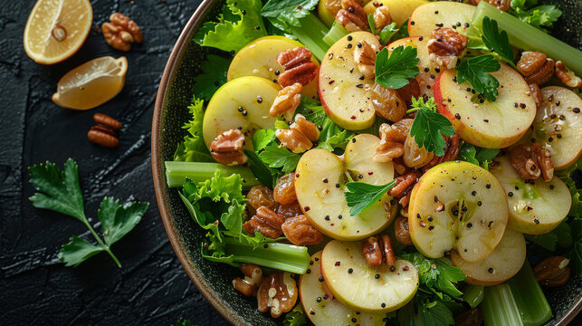 A fresh apple and celery salad with crisp apple slices, chopped celery, walnuts, raisins, and a lemon juice Greek yogurt dressing.