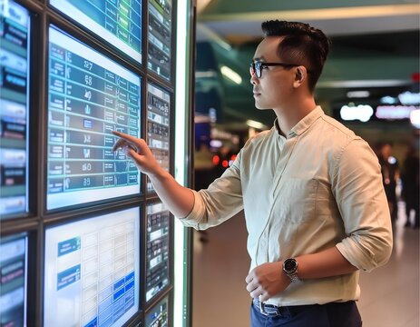 Businessman using virtual interface with digital data display