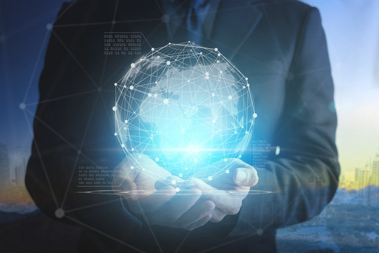 Hand holding touching glowing blue earth hologram on dark black background. Business and innovative technology concept. Modern tech and metaverse theme. People futuristic worldwide business networking