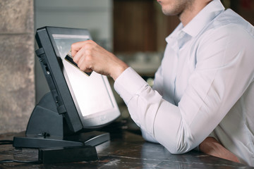 Contactless payment holding green credit card with touch settlement paying for shopping nfc technology transaction cashless technology and credit card payment. Paying with a contactless bank card.