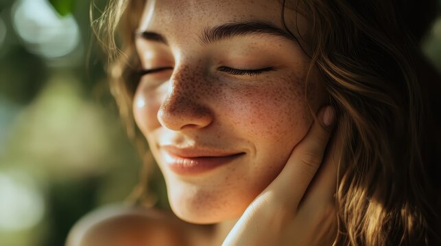 A woman is face, radiant with mirth, crinkled at the corners of her eyes as she gently touched her skin, a gesture of contentment and self-love.