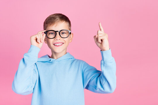 Photo of small clever boy arm touch eyewear point finger up empty space isolated on pink color background