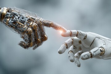 Robot hands touching fingertips symbolizing connection, artificial intelligence, technology, and future possibilities for learning and communication
