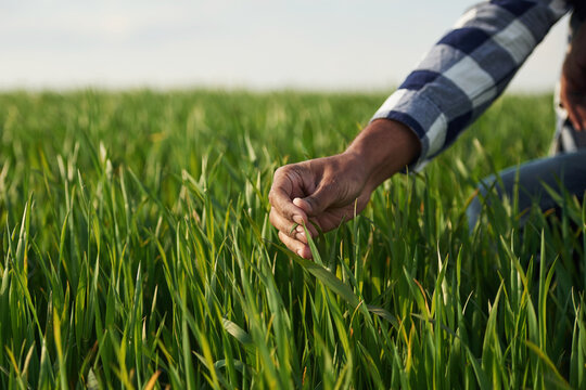 Close up view. Man's hand touching the grass on the agricultural field