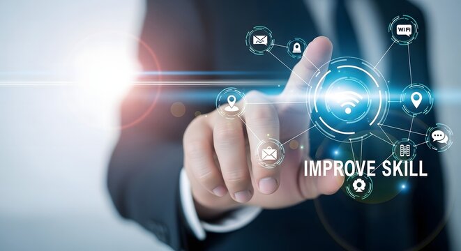 Businessman s finger touching a glowing digital interface with the words improve skill and icons representing progress and development