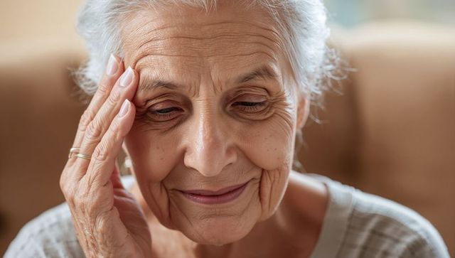 Mature woman at home touching her temples, feeling overwhelmed and stressed. She appears distressed and in need of comfort.
