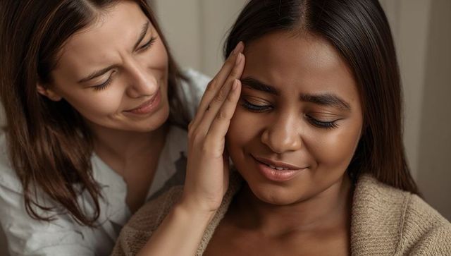 Close-up portrait woman comforting partner with gentle temple touch expressing tender support