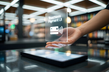 Contactless payment with smartphone at modern counter, secure transaction, blurred background