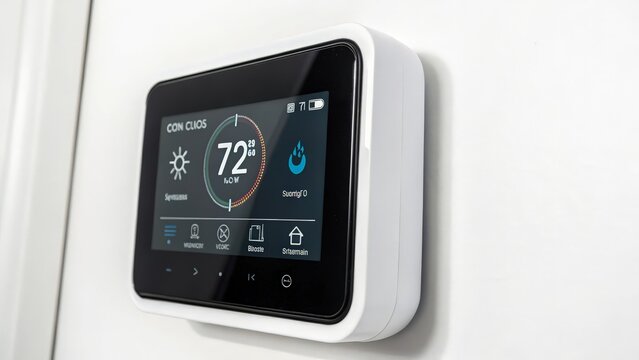 Wall-mounted digital thermostat device in blurred home interior displaying temperature and air quality details. Integration of intelligent home technologies for enhanced daily living and home comfort
