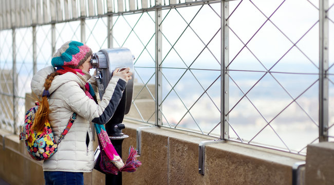 Happy young woman tourist at the observation deck of Empire State Building in New York City. Female traveler enjoying the view of NYC skyline.