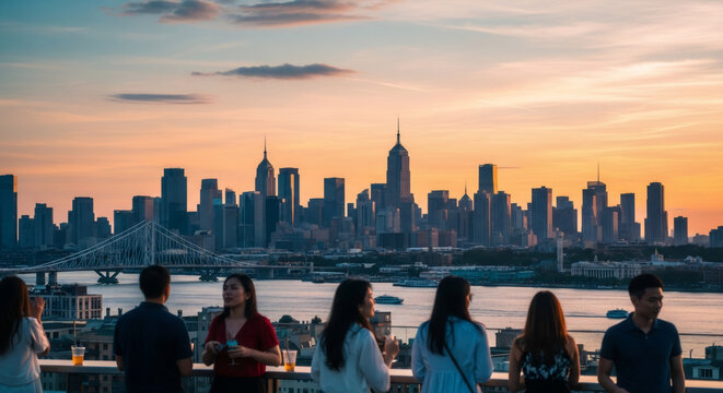 Group of people enjoying sunset view of New York City skyline from rooftop. Urban landscape, social gathering, and tourism concept. Iconic Manhattan skyscrapers silhouette.
