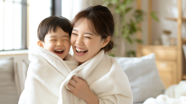 Mother wrapping her smiling baby in a towel after a bath, capturing a tender moment of love and bonding at home