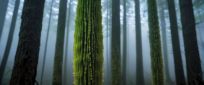 View of an enormous horsetail plant stem its segmented structure gleaming with moisture set against a background of towering primitive trees and dense fog