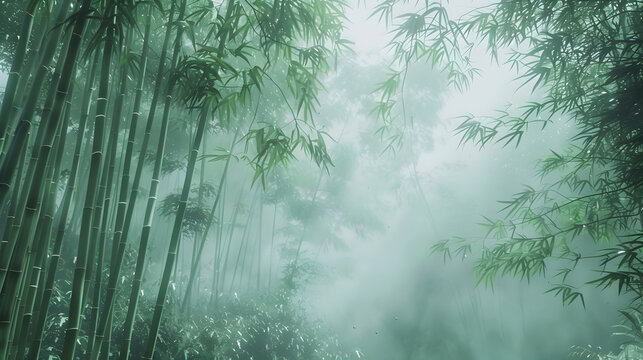 A misty bamboo forest emerges in a traditional Japanese ink painting, featuring towering stalks reaching into the foggy sky, capturing timeless elegance with soft, muted colors
