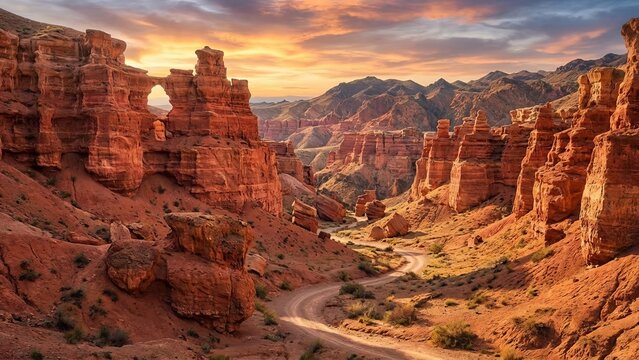 Charyn canyon in kazakhstan presenting a dramatic desert landscape with towering red sandstone formations and a natural arch under a colorful sunset sky, highlighting the rugged natural beauty