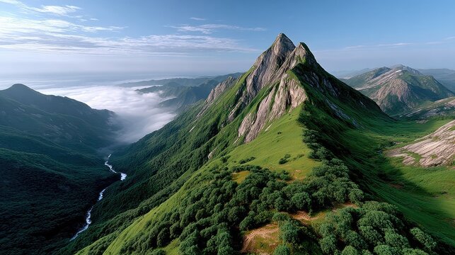 Majestic Mountain Ridge: A breathtaking aerial view of a towering mountain ridge, adorned with lush greenery, that leads the eye toward an endless horizon.