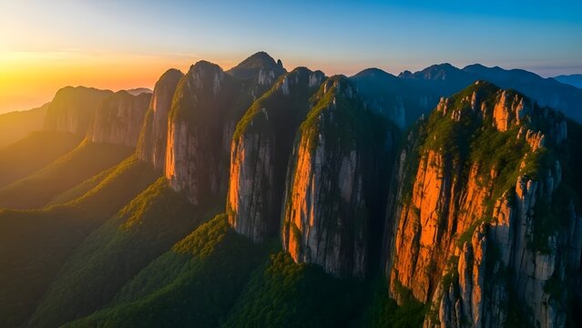 Sunset over a rugged mountain range with towering cliffs and peaks