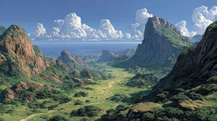 Serene coastal landscape with lush cliffs and ocean waves
