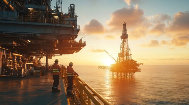 Oil rig towering over the ocean at sunrise, with workers in safety gear inspecting machinery, highlighting the scale and complexity of offshore drilling operations