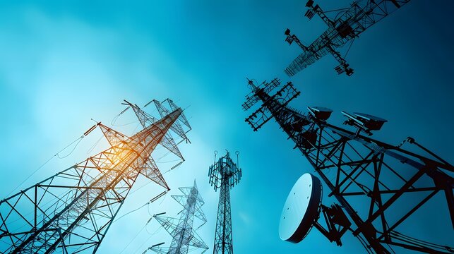 Towering Above: A low-angle perspective captures the intricate network of towering communication towers against a vibrant blue sky, symbolizing the vast reach and power of modern technology.