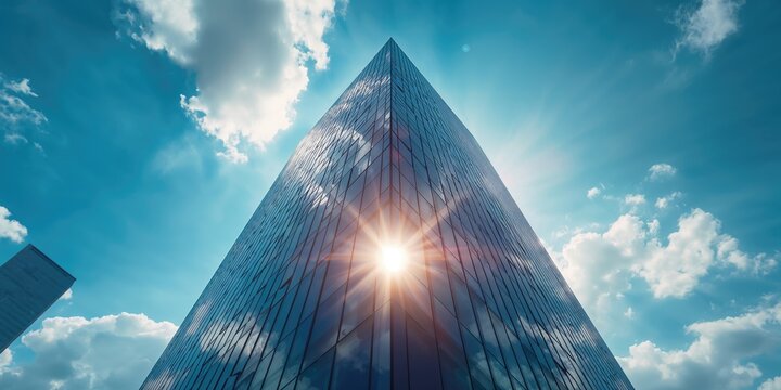 Framing urban corridor between glass skyscrapers reflecting sunset over multi-lane avenue