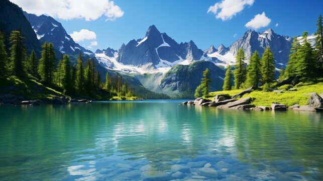 Breathtaking Swiss lakeside scene featuring verdant meadows, green grass, and a realistic portrayal of the serene alpine environment with towering mountains as the backdrop Generative AI