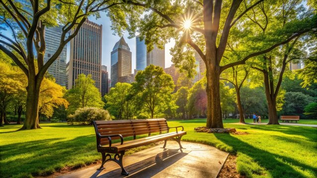 A serene wooden bench stands alone on a lush green lawn surrounded by towering trees in a peaceful New York City park on a sunny day.