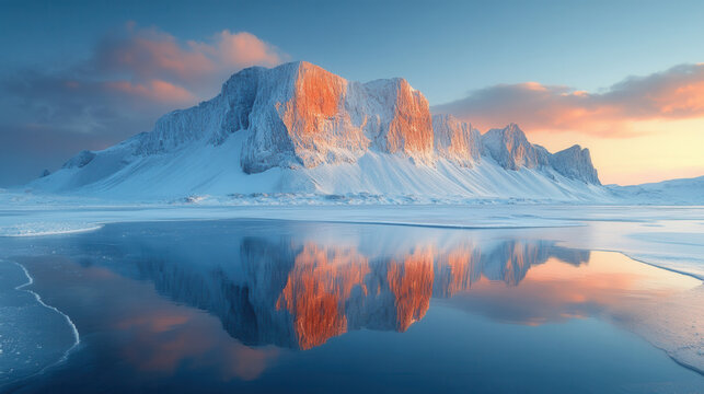 crystalline frozen lake reflecting towering pyramid rock, dramatic winter scenery