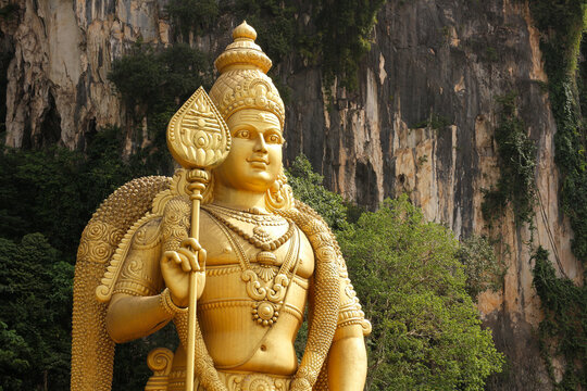 Grandeur of the Batu Caves in Kuala Lumpur, Malaysia. Towering golden statue of Lord Murugan against backdrop of lush green foliage and imposing cave walls. Vibrant colors of Hindu temple complex