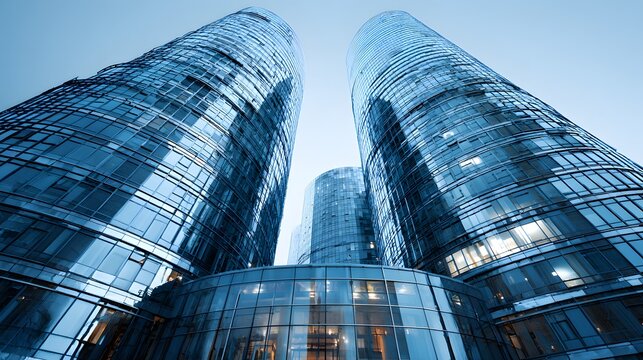 Modern, towering structures feature curved glass facades against a cool blue sky
